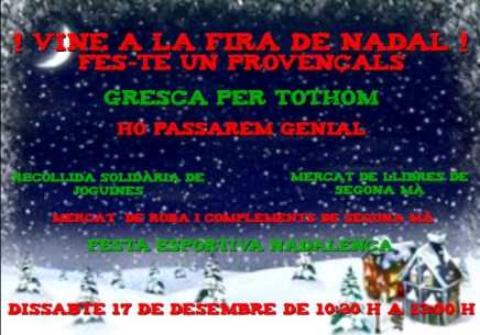 Activitats en família, Comissió Festes, ComunicacióVine a la Fira de Nadal! Moltes Gràcies! per tot el vostre suport i ajuda a la nostre Fira de Nadal. Ha estat un èxit! AFA Provençals Informació detallada de la Fira de Nadal Share this: | Comparteix:Comparteix Feu clic per imprimir (S'obre en una nova finestra) Imprimeix Feu clic per compartir a X (S'obre en una nova finestra) X Feu clic per compartir al Facebook (S'obre en una nova finestra) Facebook Feu clic per compartir al Tumblr (S'obre en una nova finestra) Tumblr Feu clic per compartir al Pinterest (S'obre en una nova finestra) Pinterest Feu clic per enviar un enllaç per correu electrònic a un amic (S'obre en una nova finestra) Correu electrònic M'agrada S'està carregant... Relacionats