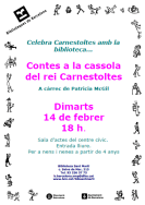 Dimarts 14 de febrer, la biblioteca celebra el carnestoltes amb “Contes a la cassola del rei Carnestoltes” una activitat infantil a càrrec de Patricia McGil. Es farà a la sala d’actes del Centre Cívic i és gratuïta.