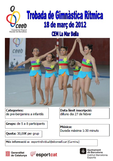 Comissió CET10, ExtraescolarsTROBADA de GIMNÀSTICA RÍTMICA 2012 TROBADA de GIMNÀSTICA RÍTMICA 2012 diumenge dia 18 de març al CEM La Mar Bella 9:00 Entrada gimnastes 9:30 reunió d’entrenadores 9:45 Prova de pista (1min x grup) 10:30 Inici de l’acte ORDRE DE PARTICIPACIÓ Share this: | Comparteix:Comparteix Imprimeix (S'obre en una nova finestra) Imprimeix Share on X (S'obre en una nova finestra) X Comparteix al Facebook (S'obre en una nova finestra) Facebook Comparteix al Tumblr (S'obre en una nova finestra) Tumblr Share on Pinterest (S'obre en una nova finestra) Pinterest Email a link to a friend (S'obre en una nova finestra) Correu electrònic M'agrada S'està carregant... Relacionats
