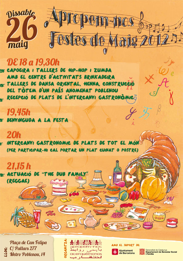 VENGAN EN FAMILIA, CON AMIGOS, SOLOS…LA BUENA COMPAÑÍA ESTÀ GARANTIZADA!! A LA PLAÇA DE CAN FELIPA DISSABTE/SÀBADO 26 DE MAIG DE LES 6 DE LA TARDA A LES 22,30 DE LA NIT, TALLERS DE DANÇA ORIENTAL, HIP-HOP, CAPOEIRA, ACTUACIONS MUSICALS I EL FAMÓS INTERCANVI GASTRONÒMIC DE PLATS DE TOT EL MÓN (RECORDEU QUE PER PARTICIPAR-HI CAL PORTAR UN PLAT CUINAT O POSTRES)