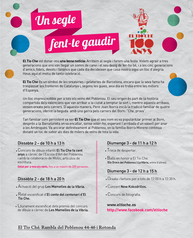 El Tío Ché tiene una buena noticia para daros: Alcanzamos el siglo. Y vamos a agradecer: A tres generaciones que nos legaron un sueño de cambio y sus ganas de hacer. Y a las cinco generaciones de amigos, fieles, devotos y fanáticos que deciden cada día hacer de nuestra casa el lugar de la alegría. Mirad cuánto motivo para celebrar. Tio Che