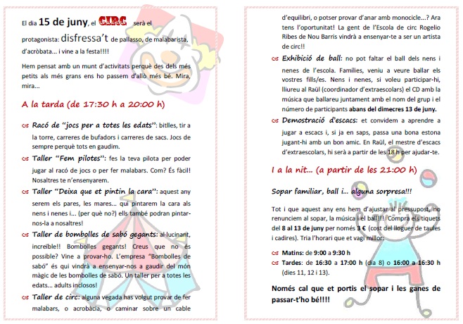Activitats en família, Comissió FestesFesta de Final de Curs de l’Escola Provençals 2012 Som-hi! Veniu tots! Aquest anymés que mai gaudim tots junts de la festa de l’escola!!! Share this: | Comparteix:Comparteix Feu clic per imprimir (S'obre en una nova finestra) Imprimeix Feu clic per compartir a X (S'obre en una nova finestra) X Feu clic per compartir al Facebook (S'obre en una nova finestra) Facebook Feu clic per compartir al Tumblr (S'obre en una nova finestra) Tumblr Feu clic per compartir al Pinterest (S'obre en una nova finestra) Pinterest Feu clic per enviar un enllaç per correu electrònic a un amic (S'obre en una nova finestra) Correu electrònic M'agrada S'està carregant... Relacionats