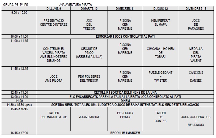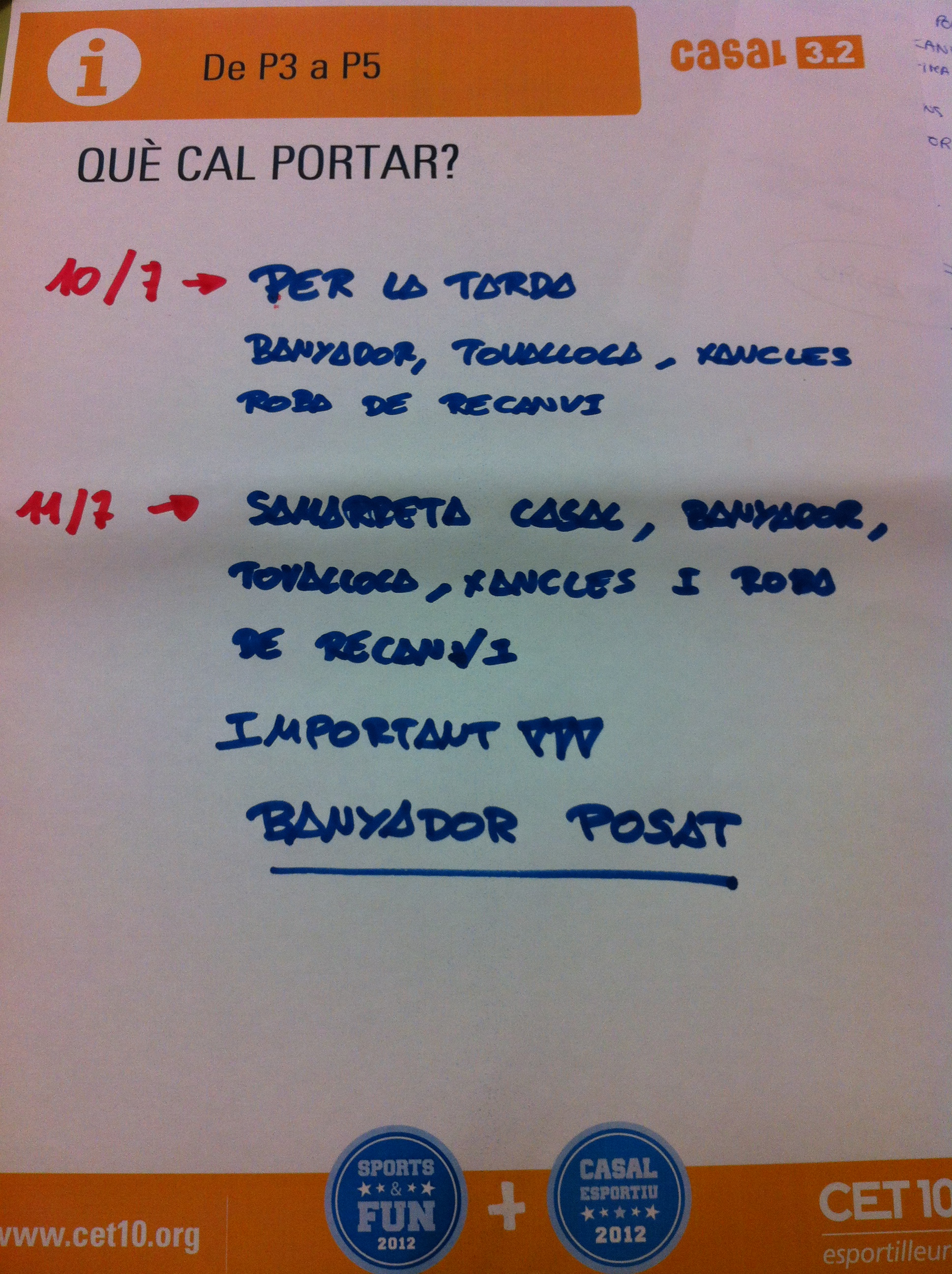 – 11 de juliol: Samarreta de Casal, banyador, tovallola, xancles, crema protecció solar i roba de recanvi.