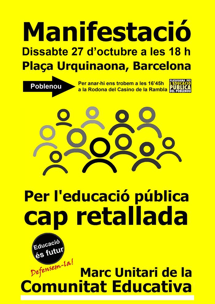 Ens posem en contacte per fer-vos una crida a la participació a la manifestació convocada pel MUCE (Marc Unitari de la Comunitat Educativa) dissabte, 27 d’octubre, a Barcelona, amb l’objectiu de protestar contra les retallades que ja estem patint en l’educació i les que es puguin produir coincidint amb l’aprovació dels propers pressupostos de la Generalitat de Catalunya.