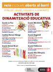 Des del programa Patis Escolars Oberts al Barri, impulsat per l’Ajuntament de Barcelona des de l’Institut Municipal d’Educació de Barcelona, amb el suport dels districtes de la ciutat i la col·laboració de la Fundació Jaume Bofill i del Consorci d’Educació de Barcelona, us fem arribar en document adjunt el cartell promocional amb la informació de totes les escoles que tindran dinamitzacions aquests mesos d’octubre, novembre i desembre al vostre districte amb les adreces i els horaris de cadascuna, us convidem a venir amb els vostres amics, família, veïns/es…!