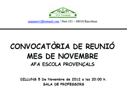 Convocatòria de reunió mes de novembre AFA Escola Provençals