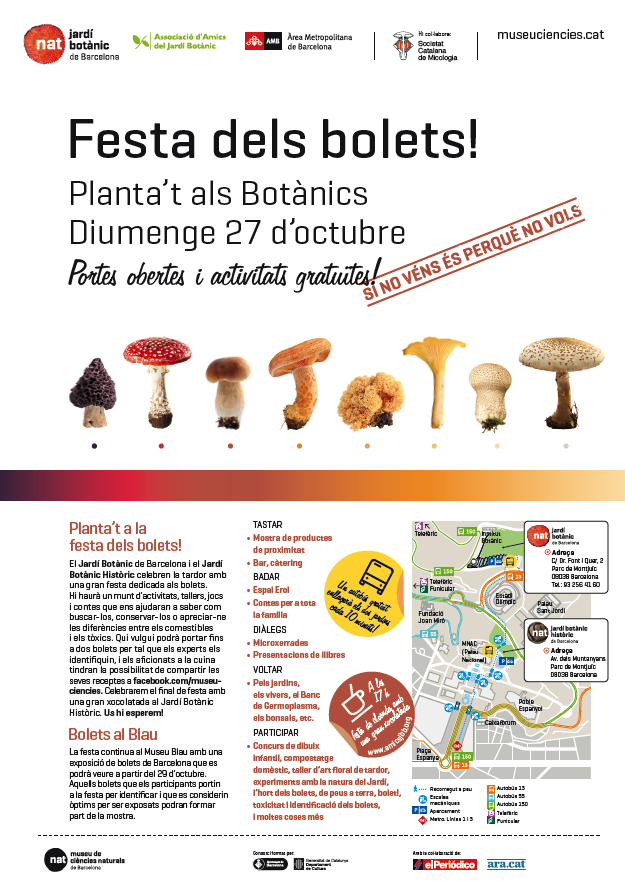 Arriba la Tardor i els paisatge s’omple de colors càlids: marrons, morats, taronges, vermells. Neixen nous fruits i els recol•lectors es posen en marxa . El Jardí Botànic i el Jardí Botànic Històric de Barcelona us conviden a ser boletaires en una gran festa per a tothom, plena de tallers, gimcanes, llibres, experiments, jocs i moltes més activitats relacionades amb el fong . Vine a passar un dia en família, en parella o amb amics en un paisatge immillorable amb vistes panoràmiques sobre Barcelona , l`àrea metropolitana i el Delta del Llobregat.