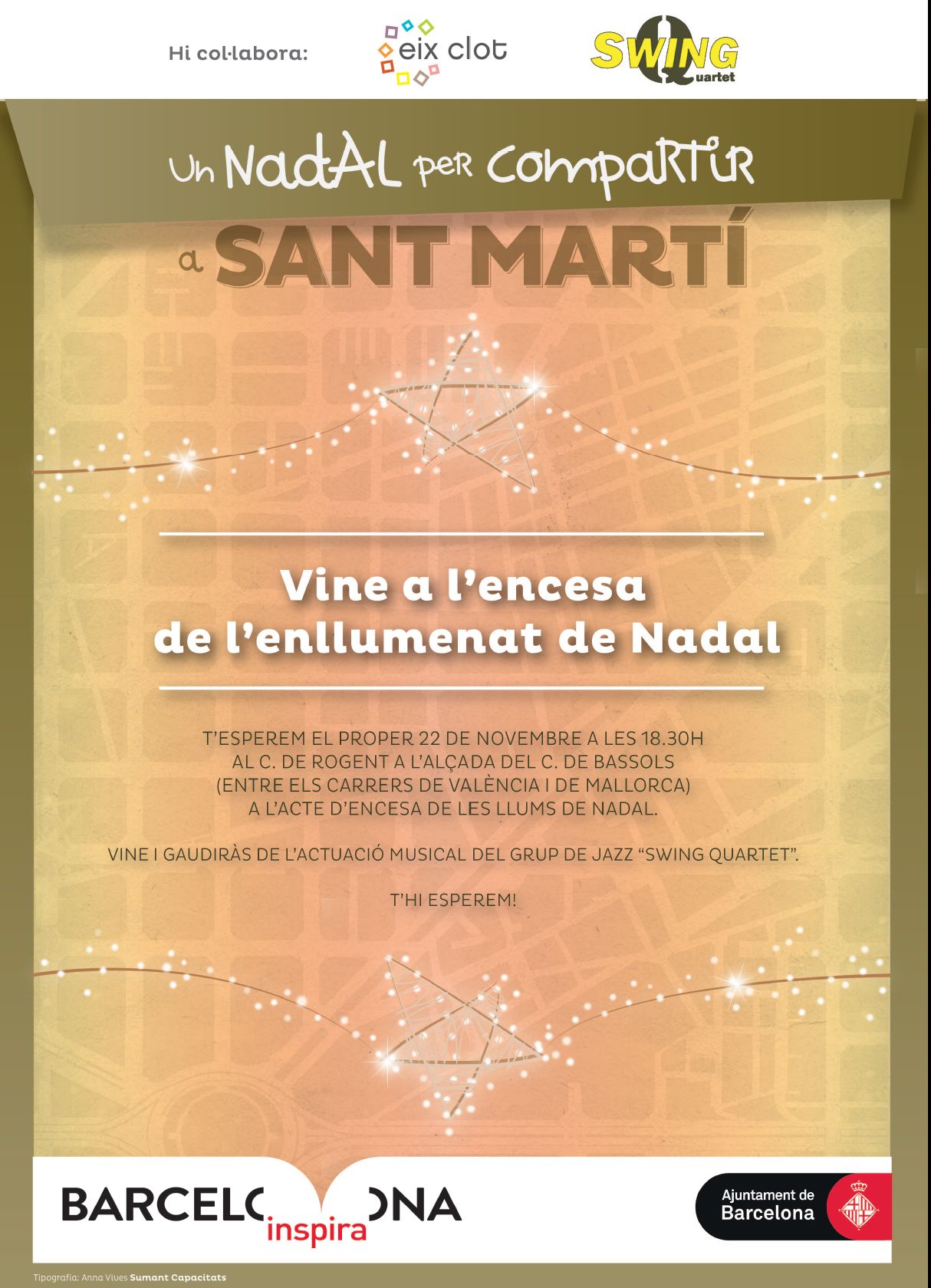 Avui a les 18:30h al carrer Rogent, a l’alçada del carrer Bassols (entre els carrers València i Mallorca) per encendre les llums de Nadal a Sant Martí. Amb l’actuació del grup de jazz “Swing Quartet”