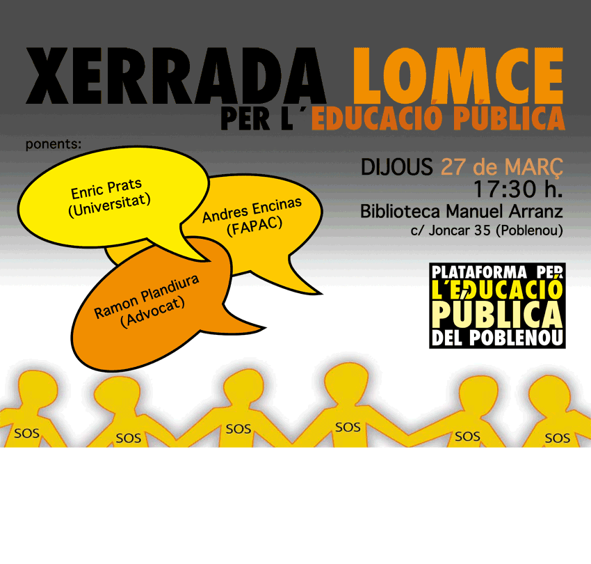 Formació Pares / Professors, XerradesAvui a la Biblioteca Manuel Arranz: Xerrada LOMCE, per l’educació pública Informació sobre una xerrada LOMCE per l’educació pública que tindrà lloc a la Biblioteca Manuel Arranz avui dijous 27 de març a les 17:30 h. C/ Joncar 35 (Poblenou) Share this: | Comparteix:Comparteix Feu clic per imprimir (S'obre en una nova finestra) Imprimeix Feu clic per compartir a X (S'obre en una nova finestra) X Feu clic per compartir al Facebook (S'obre en una nova finestra) Facebook Feu clic per compartir al Tumblr (S'obre en una nova finestra) Tumblr Feu clic per compartir al Pinterest (S'obre en una nova finestra) Pinterest Feu clic per enviar un enllaç per correu electrònic a un amic (S'obre en una nova finestra) Correu electrònic M'agrada S'està carregant... Relacionats