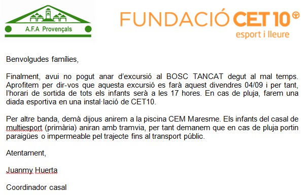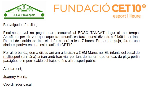 Comissió de Casals i ColòniesCasal 31/8-4/9: Canvi planificació M'agrada S'està carregant... Relacionats
