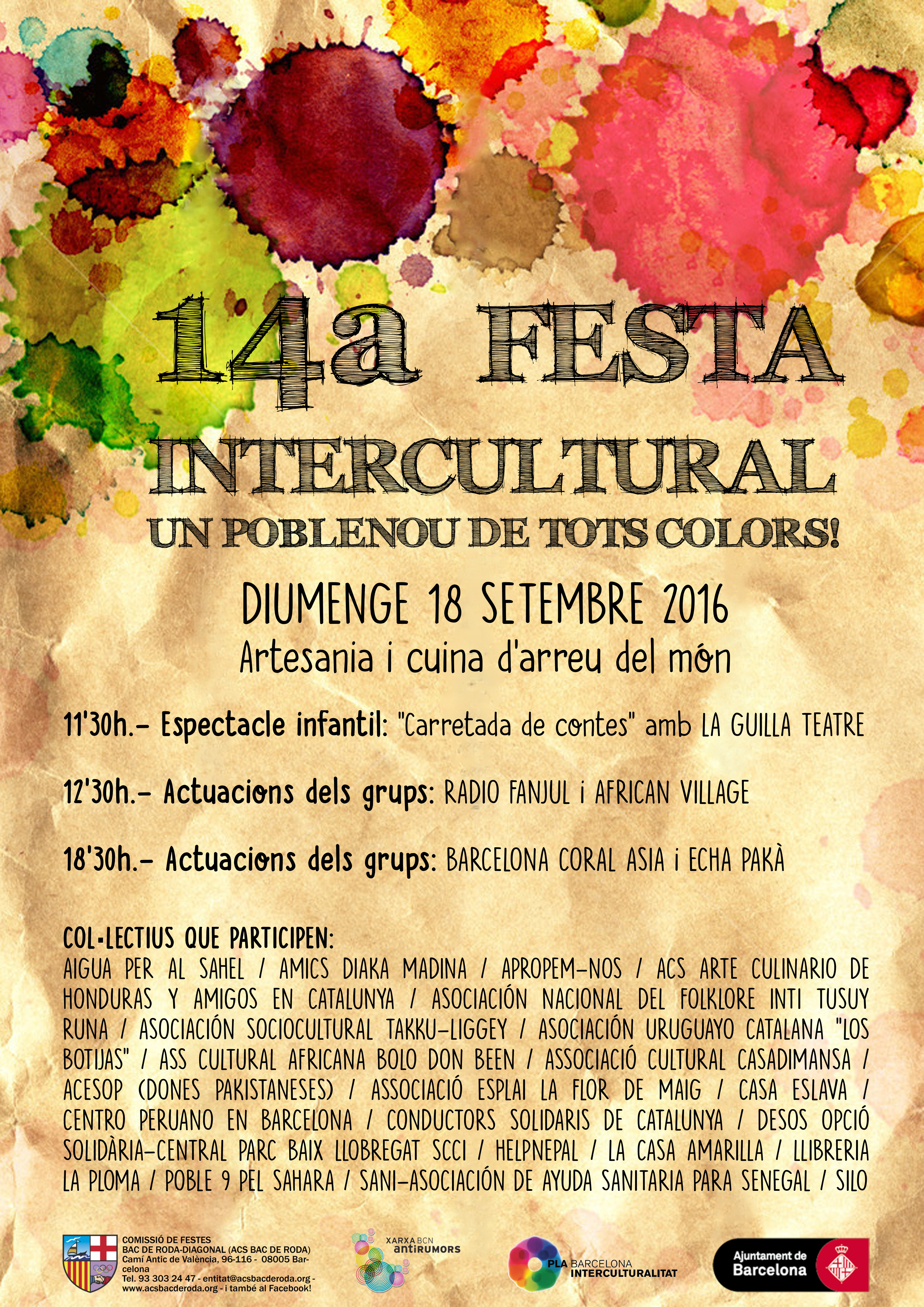 La 14a Festa Intercultural “ Un Poblenou de tots colors!” tindrà lloc el diumenge 18 de setembre al Parc Central del Poblenou (entrada per Bac de Roda) des de les 11’30 fins les 21h.