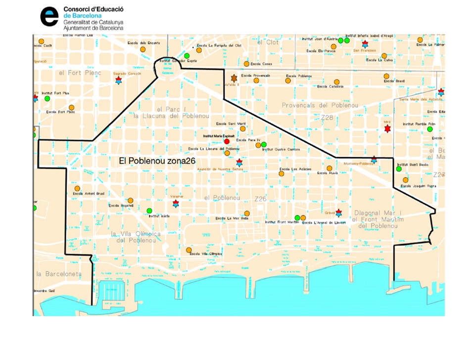 El Consorci d’Educació de Barcelona té repartit el terreny de la ciutat en 29 Zones a efectes d’escolarització.