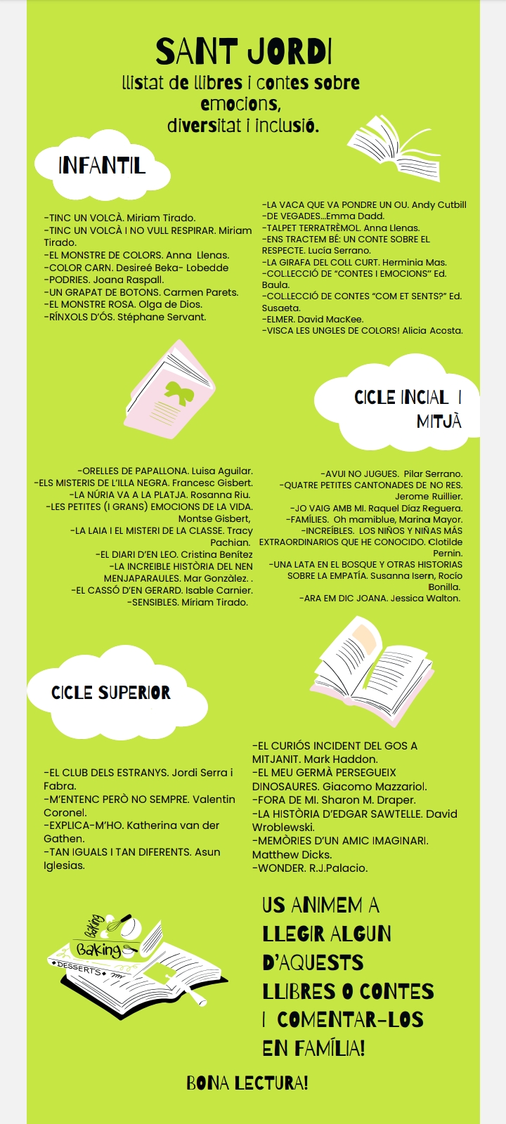 Arriba Sant Jordi i desde la comissió de Diversitat volem compartir amb vosaltres un recull de títols de contes i llibres que tracten temes com la diversitat, les emocions, la inclusió,…