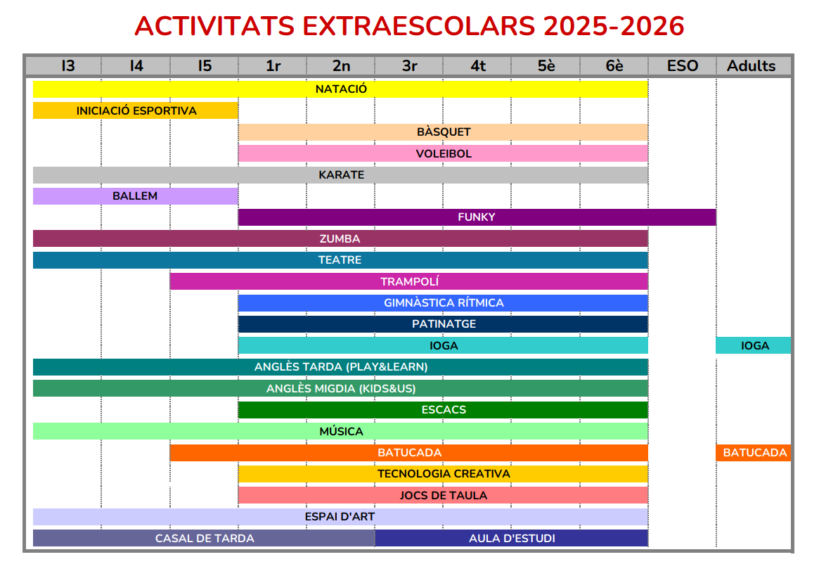 ACTIVITATS EXTRAESCOLARS 2025/26 En el quadrant següent podeu trobar totes les activitats del curs 2025/26 que s’oferiran a cada curs. Cliqueu sobre la imatge per ampliar-la. Consulta els horaris i la descripció de les activitats: Horaris i preus Descripció de les extraescolars Share this: | Comparteix:Comparteix Feu clic per imprimir (S'obre en una nova finestra) Imprimeix Feu clic per compartir a X (S'obre en una nova finestra) X Feu clic per compartir al Facebook (S'obre en una nova finestra) Facebook Feu clic per compartir al Tumblr (S'obre en una nova finestra) Tumblr Feu clic per compartir al Pinterest (S'obre en una nova finestra) Pinterest Feu clic per enviar un enllaç per correu electrònic a un amic (S'obre en una nova finestra) Correu electrònic M'agrada S'està carregant...