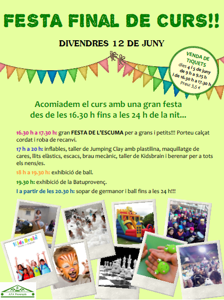 FESTA DE FINAL DE CURS: i per acomiadar el curs celebrem una gran festa amb totes les famílies, amb activitats per a totes les edats durant la tarda. I per la nit, gran sopar de germanor al pati, amenitzat amb música en viu o de DJ.