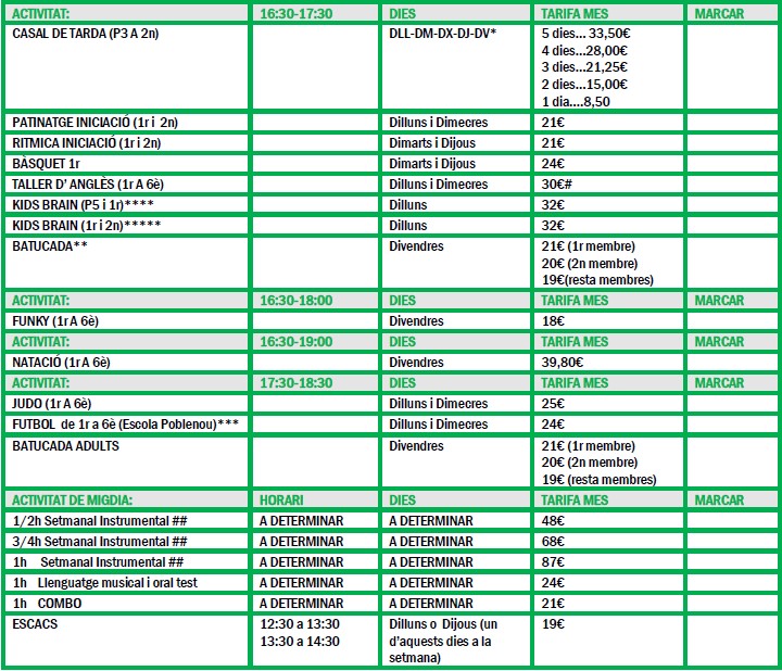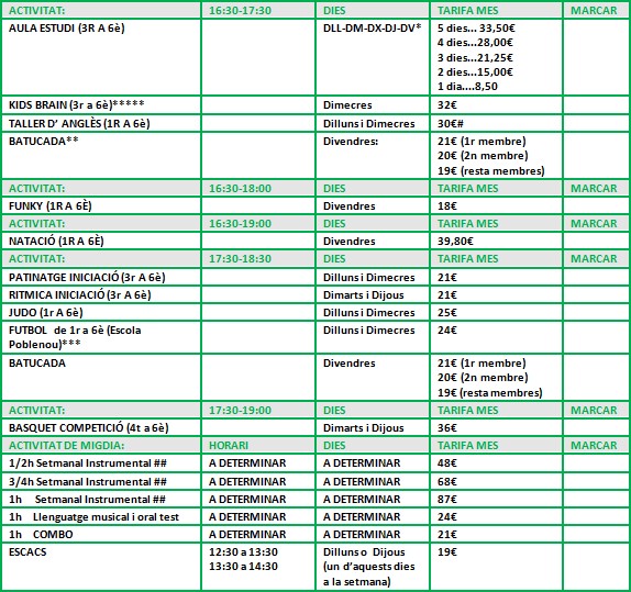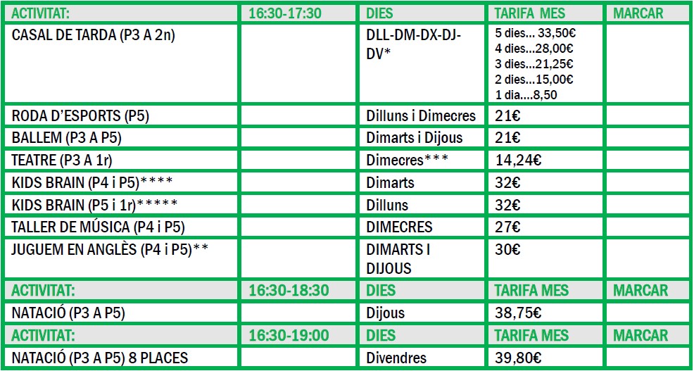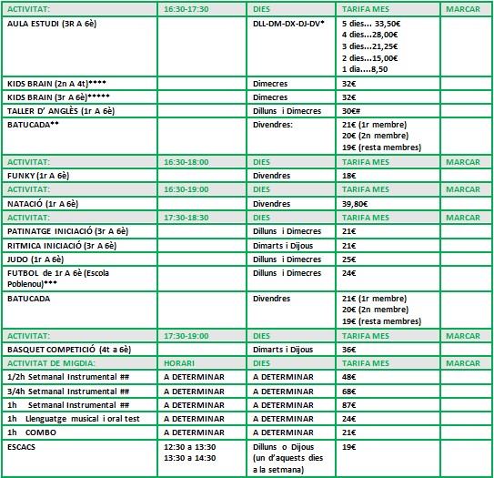Les extraescolars comencen l’1 d’octubre i acaben quan s’inicia la jornada intensiva al juny (excepte les de migdia).